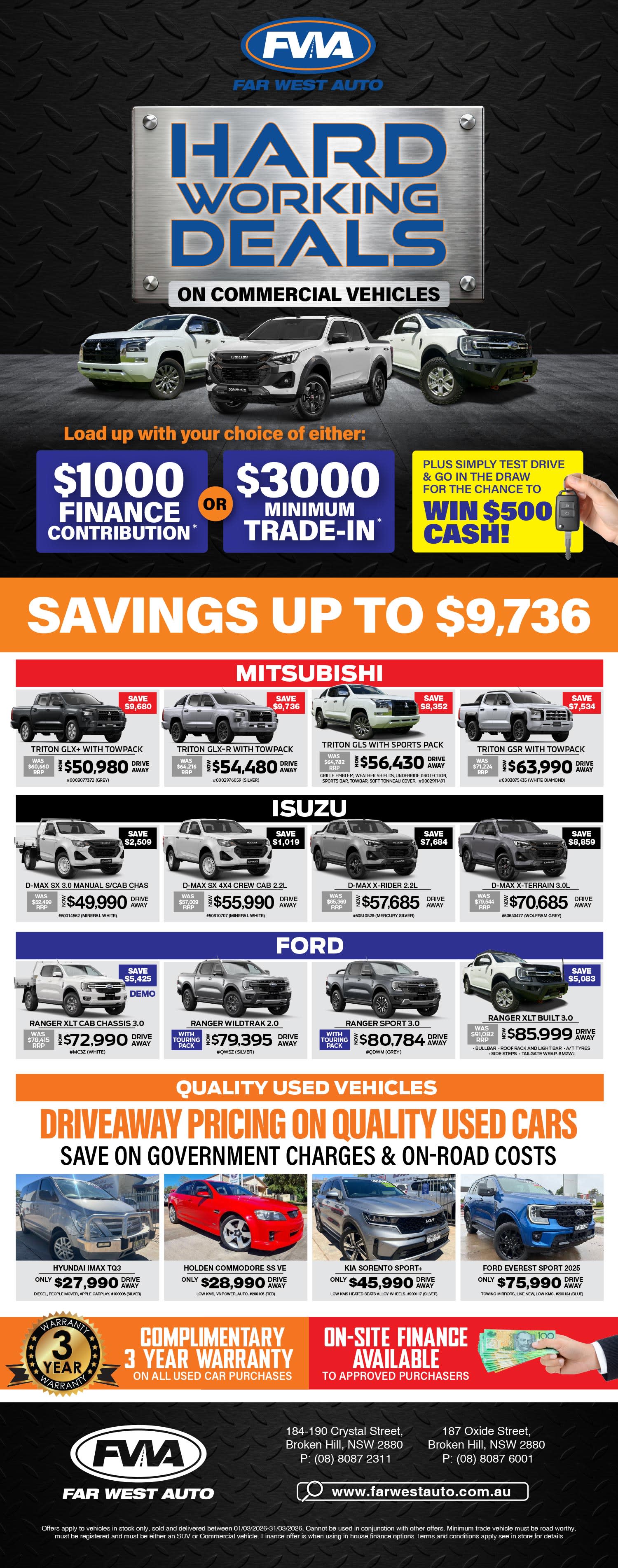 Far West Auto. Car Dealership in Broken Hill NSW. Dealer License: LMVD 071057. Motor Vehicle Repairer: MVRL 55389. Copyright © 2026. All Rights Reserved.